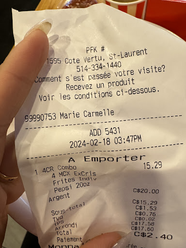 Read moreI came to this KFC near Metro Côte-Vertu expecting some crispy chicken and maybe a side of regret. What I didn’t expect was to witness a masterclass in customer service delivered by none other than the queen of the cash register herself — Marie.