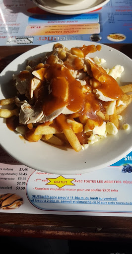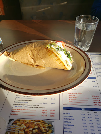 Bref je prend take out et je vais manger au parc. Aucuns plaisir à manger cette poutine, dans les pires poutines que jai mangé dans ma vie et j'ai 35 ans, je ne sui spas à ma premiÚre poutine.... bref.... frites congelés qualité Mc cain epicerie, fromages en grain cheapo et pas frais...enfin je me dit: la poutine etait médiocre et j'espÚre juste ne pas avoir mal au ventre! et bien la cerise sur le sunday je me tape un mal de ventre toute la journée au point que rendu à l'heure du souper j'étais pas capable de manger une bonne pizza maison que j'ai fait pour le reste de la famille, moi trop mal au ventre, surement à cause du fromage pas frais jaunie ou je ne sais quoi, peu importe en plus de gùcher mon dinné, j'ai gaspiller mon argent et gùcher toute ma journée avec ce mal de ventre! Bon je sais pas si le reste du menu est bon mais ne compté pas sur moi pour gouter le reste de leurs plats!