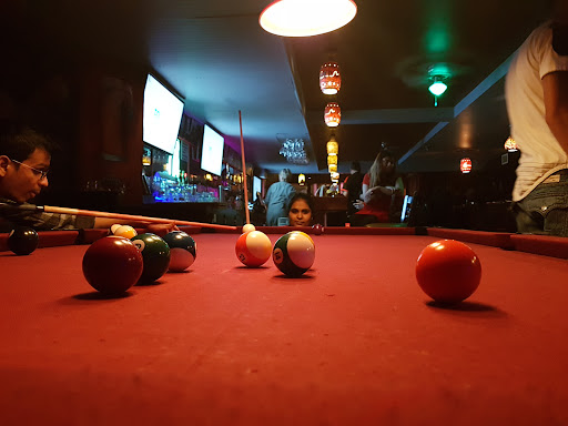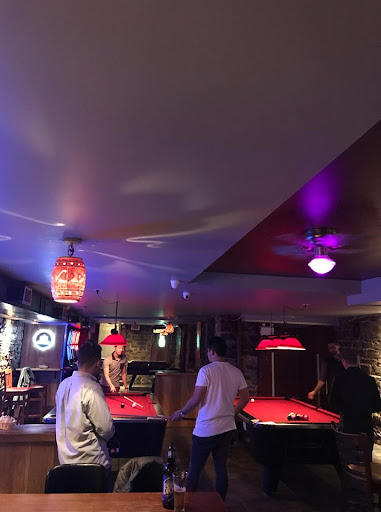 Relaxed, dimly lit basement bar with stone walls offering cocktails, pool tables & jukebox music.