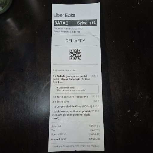 Read moreSERVICE INNACCEPTABLE!!! 1h15 d'attente pour recevoir mon repas (le restaurant est à 10min de chez moi)... La sauce de ma salade cesar était déjà dans la salade et tout avait coulé dans le sac... La nourriture était complètement froide, les frites molles et les languettes de poulet également... Pas mangeable!!! J'avais demandé 2 sauces aigre-douce, il m'ont envoyé 2 sauces miel et moutarde et BBQ (???)... J'ai dit au téléphone que j'allais payé par carte de crédit, le livreur arrive chez moi sans sa machine et me rit au visage, trouvant ça très drôle... C'est par chance que j'avais de l'argent sur moi... Que serait-il arrivé sinon? Il m'aurait laissé le repas gratuitement?! Non seulement ça, je prend la peine de rappeler au restaurant pour expliquer au gérant ce qui venait de m'arriver, il me crit dessus en me disant que jamais ils n'ont reçu de tels commentaires et il essaie de me dire que j'exagère... D'une impolitesse!!! Et vous voulez rire encore plus? IL M'OFFRE 5$ DE RABAIS SUR MA PROCHAINE COMMANDE!!! Non mais il a du culo... C'est vraiment rire de ses clients... En plus il ose me dire qu'il doit raccrocher car ils sont très occupé. C'est dommage pour lui que mon conjoint soit l'un des meilleurs avocats au Québec... Il va se faire un plaisir de les poursuivre aux petites créances... Jeu d'enfant pour lui... Et moi qui voulait seulement un repas chaud pour terminer la journée d'enfer que j'ai eu! Fatiguée et n'ayant pas eu le temps ni l'énergie de me faire à souper, enceinte de...