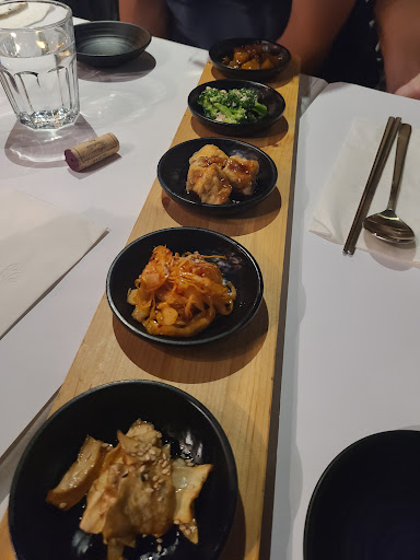 Where do I start. For one, I am very surprised about the reviews of this restaurant and how high they are. It is very expensive for what you get, not worth the money at all. For two people table d'hôte (35 or 45 dollars depending on how appetizers you want) they begin the meal with somewhat traditional Korean side dishes like spicy cabbage salad, kimchi cucumbers (or variation of it) but for two people you literally get 2 half size cucumber slices (no joke), a few strands of cabbage, two cubes of potatoe and a square of cabbage dipped in soy sauce. Like you had to divide strands of cabbage for everyone to get a bite. I feel like it's better not to serve that than serve such absurd size dishes. Then came the apetizers, they couldn't even split it by couple, they put it by three so it gets akward splitting it. You get two dumplings, Sammon with daikon and a piece of chicken that resambles general tao chicken. Finally come the main meal. The dishes are small, barely any rice in bowls. The flavors are good but don't come there hungry, the portions are kinda small. Oddly enough the restaurant doesn't even have some signature Korean dishes, no kimchi offered with the meal. The waiters were very curtious, friendly and helpful. The kitchen service was quite slow considering most of these dishes are precooked. Food was over priced and not worth it. On another note, the place was so warm and jam packed with people. I understand the maximization happening but wow it's way too many people in one small space. The whole bar counter was packed wish dirrty dishes, it was just making it everything seem even that more chaotic. It needs to improve to reach the rating it has. It's trying to be fancy byow but that's about it. I would not go back. 120 dollars for not much average food.