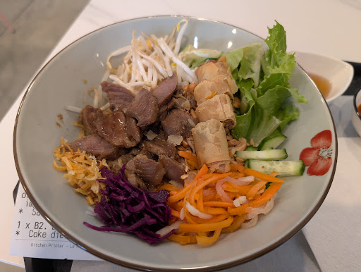 Read moreI stopped in for a late lunch as it was just across the street from where I'm staying and had good reviews. I ordered the bun cha gio/vermicelli bowl and a diet coke. The bowl comes with vermicelli as a base, your choice of protein (chicken, pork, beef, mushroom, etc), a spring roll, greens, cucumbers, pickled carrot and daikon, sprouts, cabbage, some peanuts, fried shallots and some mint/herbs. They asked if I wanted fish sauce with it (yes please!) or soy sauce and I also asked for some Sriracha.