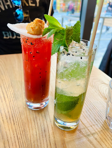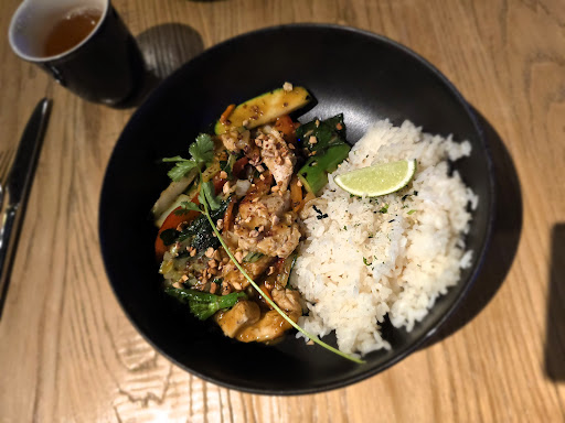 Read moreThe dumplings we had for an appetizer were outstanding - we had the pork and kimchi, fried, and the little chicken wonton dumplings, also fried. They were delicious. The sauce that came with the chicken ones was delightful - like an Asian bbq. We also ordered a spicy Bloody Mary-type drink and a mojito - both very delicious. That’s where the meal stopped being so yummy. My husband got the Thai coco (similar to Tom Kha) soup. That was underwhelming. It has 2 peppers indicating spiciness in the menu, but it was definitely not spicy at all. The cherry tomatoes and celery in the soup were confusing and didn’t fit with the flavor profile. The giant leaves of cilantro really needed to be chopped a bit smaller. It also needed more coconut juice and less lemongrass. My husband got a spicy salmon poke bowl for his main meal. It was fine aside from the addition of celery and tomatoes. I got the red curry. It was fairly bland. It had one red pepper, signaling slightly spicy and it definitely wasn’t. My recommendation - go for a fancy appetizer and drinks if you want to spend money. Otherwise, find somewhere else for good Asian and/or...