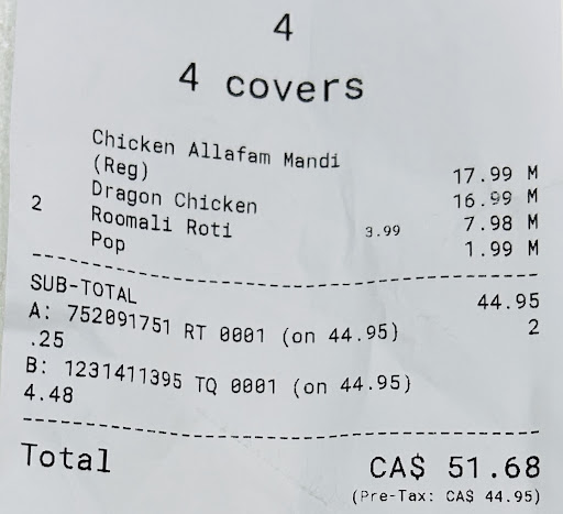 Throughout this experience, I sensed a lack of supervision or management oversight. Given the significant investment made in the establishment, it would be prudent to have a designated individual to oversee operations and guide the staff. Additionally, many of the dishes were excessively spicy and oily. I tried the Mandi Alfahm, which did not resemble the traditional Arabic recipe. Furthermore, the prices were considerably higher compared to Indian restaurants in Montreal.