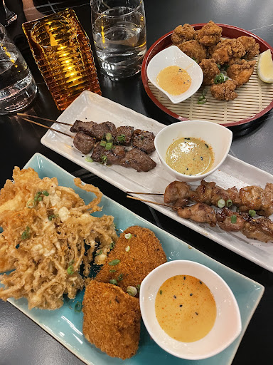 The food here was just very mediocre. I will have give that their menu was very creative. We had ordered their chicken yakitori, which was ok. One piece felt it was definitely overcooked(texture was like cardboard) Our waitress recommended the aged beef yakitori since it will off the menu soon. I was thinking it must be the item wasn’t selling, hence they would have this decision. But we decided to try it anyways. Worst. Beef. Skewer. It was dry, and overcooked. Almost eating like cardboard. Another appetizer we had ordered was their tempura. I was expecting a traditional Japanese tempura with soy sauce. When we received our order, the sauce was spicy mayo and the batter was thick, exactly what you would get in a restaurant bar setting. Not your traditional Japanese tempura.