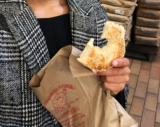 She leaves the bouldering gym and her tired feet shuffle to the heart of the Mile End. She finally spots the familiar sign, lit up by the glowing light within the shop, and quickens her step towards salvation. She steps within, the warmth welcoming her like a mother embracing its child. The sight of dough being cut, the wood scraping the bottom of the oven to deposit the circular breads into the furnace, the kind greeting of the cashier wearing food-safe gloves: a comforting sight indeed. Only the best and freshest goods are selected for her: the savoury rosemary and salt, the sweet and hearty muesli and traditional sesame of course. Clutching the hot bag to her chest with a smile on her face, she pays her fare and quietly thanks the gods of carbohydrates for providing such a sustaining and affordable treat to the Montreal population. She makes her way back into the darkness outside, places a chewy bagel into her mouth and carefully drops her precious cargo into her bicycle basket before setting off towards the Plateau. It isnāt only bagels she will be bringing home ā it is the pungent smell of sesame, the kindness of strangers and most importantly, the sense of truly belonging to a community.
