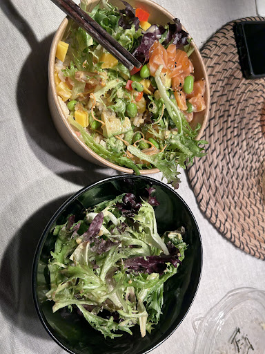 Sushi is slightly overpriced in my opinion for what you get but it tastes good, fresh and quickly prepared. The only weird thing is the order you receive your order. Usually you get tea, miso and appetizer, then sushi. In my case I got sushi and then miso then appetizer. I don't know if tea was extra but I didn't get any, along with no water for dine in. Salad was okay, miso was alright. I may have high standards due to being from BC though.