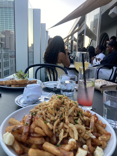 Going to more important matters, the service was mediocre. The hostess gave us only to one menu for three people and only the menu for drinks. We had to call the waiter and ask for the food menu. We ordered fried calamari, dumplings and fries and a few drinks but the food wasn’t good at all (the dumplings tasted like plastic and the calamari had been refried at least three times). Is it really the chef checking the preparation of the food? I doubt it. If he does it, he should not be called a chef. The food tastes better in any of the many bars and in Montreal where you get the same menu for half the price. The waiter didn't even bother to come and ask if the service was ok or smile at all. On the positive note, the bathrooms were well-maintained and smelled good. In conclusion, go for a drink, take a photo of the sunset and don’t expect quality because you...
