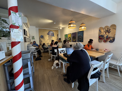 Read moreMy friend and I stayed from 2pm to 8pm on a hot Sunday afternoon. We sat on the sofa, a blanket was there as AC was cold, casheer lowered it (thx) without us asking, very thoughtful. The food was tasty: cranberry bread with Brie, gaspacho soup, lemonade and a big cookie. The menu was written big enough that I could read it from the sofa. (Thx to Lasik), music was good too and casheer got busy selling ice cream. A lot of wolves decorations, drawings from children and artwork. My friend invited me there as she is also an 🎨 and I will go...