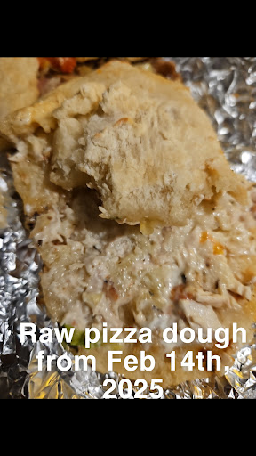 I'm attaching pictures , but unfortunately, my camera doesn't show the raw sticky white properly, especially cause of the toppings in between, making it soggy. But anyone who bakes and cooks would know right away just by the color and texture it was raw and undercooked. You could see the white flour dots and smell it. I am also adding an additional picture of the same Le Coq sub made with fully cooked pizza dough that I ordered on January 7th, 2025, to show the comparison and difference from what we received on February 14th, 2025.