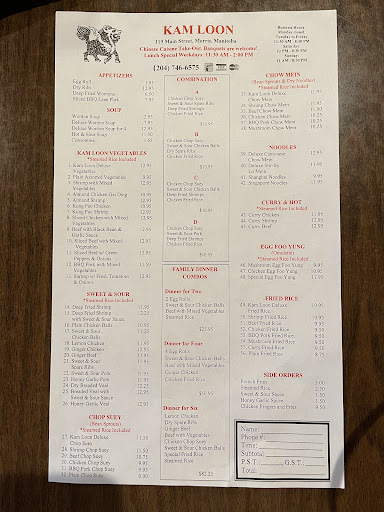 Fresh and bursting with flavor is what Kam Loon Restaurant has to offer. Serving the Morris, Manitoba area we provide great tasting food that's prepared fresh with the highest quality of ingredients. Treat yourself today with a nutritious meal from our delicious menu. At Kam Loon Restaurant you are sure to enjoy the great atmosphere, friendly service, and affordable prices. Take your taste buds on an unforgettable journey at Kam...