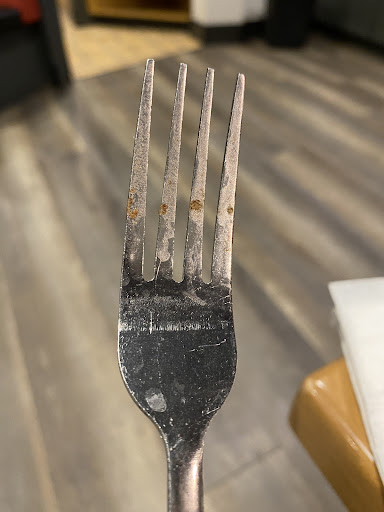 The restaurant wasn’t busy (two booths occupied, along with a few tables in the small party room) and we were seated quickly. My husband ordered a draught beer, and when he got to the bottom of the drink, there were a number of things floating at the bottom of the glass. Showed the server who agreed it was disgusting, and she poured it down the sink near our table; didn’t mention it again. Our food came out about 10 minutes later, and we opened the cutlery. Two of the three sets of cutlery couldn’t be used as they were filthy; the set my daughter used was okay. Had to wait to get the server’s attention so we could get more cutlery; she brought three more sets and the second one I opened was worse than the first. By the time the cutlery was sorted, the pizza was not nearly as hot as it should have been and while not affected by temperature, the Caesar salad was disappointingly bland. We were never asked how the food was, my husband was never asked if he wanted anything else to drink. When we were paying for our bill, we asked if she had mentioned the issue with the glass/beer to a manager and was told she hadn’t, but she would. I’m not convinced it will ever be mentioned, so I hope one reads this review. Photo is fork from the second cutlery packet: wish I had my time back and had taken a photo of the bottom of the glass. This was the third time eating at/from this location, but quite...