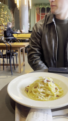 Great music, great design, great beverages—but a questionable restaurant selection. We paid $20+ for a small, oversalted, and dry carbonara plate, which was so mediocre and disappointing. We expected this premium food court to deliver authentic, high-quality pasta for that price. Instead, we got thick, unchewable noodles with a few chunks of dry ham, a bit of sticky parmesan sauce, and just salt and pepper.