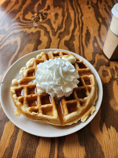 A pleasant, quaint little cafe with limited seating inside, and outside on a deck. Has a small gift section from local vendors. We went there on a Saturday before lunch and it appeared busy, and the table we sat at wasn't wiped clean. You order, pay and then pick up your food at the counter when it's done, cafeteria style. Staff behind the counter were friendly. We ordered a London Fog, which was delicious, and the waffle with syrup and whipped cream, as that was the only waffle option available at that time. The Waffles were fresh and esthetically pleasing but the butter was too hard to spread over the waffles. The syrup was already pre-poured on the waffles and the sweetness was too overpowering for us. If we had known we would have asked for the syrup on the side, and recommend others doing the same. We also thought $10.00 was a bit pricey for just a waffle. It was a first time here for us, and overall, it was a pleasant enough experience and we will return to try some other interesting items...