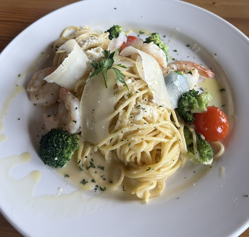 Not only did it look wonderful, but it tasted incredible. It was one of the best shrimp dishes I’ve ever eaten. No kidding. It had a light (but bursting with garlic) sauce, with a perfect touch of red pepper flakes, and shaved parmesan, as well as some tomatoes and broccoli. The shrimp was perfectly cooked too.