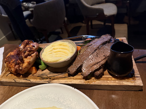 The decor is high-end rustic, lots of dark wood grain against an elegant black background. Ambience, lighting, music, acoustics are all within a comfortable level. One need never tell to be heard or squint through the dim light to see across the room. Bathrooms are roomy, easily accessible, and private. The food. Is. Amazing. No notes at all. There is a wide array of beers, wines, cocktails, and spirits available. One can order a flight of top quality whiskeys to enhance the dining experience. Also, the Maligne Range includes a quieter upper level where one can relax, work remotely, or just enjoy the atmosphere with a fine meal and drink, as well as a beautiful, picturesque balcony to be available during the warmer seasons. Of course the lifeblood of this establishment is the staff. Everyone here is exceptionally gracious, helpful, and warm.