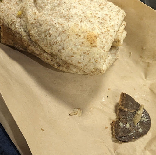 I ordered a vegetarian wrap from here recently, then went back to work. I had taken a couple of bites when I felt my teeth spring back and quickly noticed a cardboard round in my wrap.