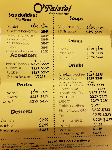 Read moreThe falafel was dry and cold in the sandwich and pretty flavorless, despite having a lot of sauce on it, which I couldn't understand and couldn't quite make out. Isn't it just supposed to be tahini anyways? I had my hopes up to find an awesome place somewhere on the island other than Campbell River but nothing has come close yet to Baba Ganouj in CR. If you have ever lived in Ontario or somewhere where there is a large population of Lebanese people you know what im talking about. Here, mediocrity rules, maybe because so many BCians just don't know the difference due to lack of exposure, and actually think its good food. The chicken shawarma wasn't much better, and definitely not what I'd ever seen as "chicken shawarma", drowned in a tomato-y sauce and rubbery. The meat is supposed to come off a spit, not the fridge and then microwaved in heavy sauce. Why would you not do it proper? I couldn't even taste the chicken which is usually the star of the sandwich. Too bad. Thank God there's Baba Ganouj. Can't wait to be able to go visit Campbell...