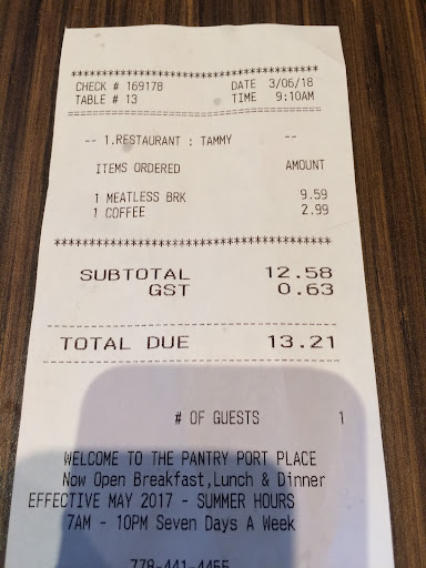 Read moreWe hoped to have a nice Mother's Day brunch today and chose the Pantry because it used to be a family favorite when I was younger. We were seated after waiting for awhile at the door and the waitress took our order within a few minutes. That was pretty much our only interaction except when she brought us our food and bill. To be fair, there were only two servers on and the place was full, so our waitress had her hands full. I can't tolerate gluten so ordered just a few sides and the rest of my party ordered breakfast items. We didn't have our food for half an hour after we ordered but noticed that two other tables were served before us even though they arrived well after we did! When our food arrived, it didn't look very appetizing so I touched the egg with my bare hand. Cold. The hashbrowns were dry and barely lukewarm. The sausages were hot, though. We had to flag another girl down to ask for refills of water, and I asked for cream for my tea and my son asked for a sprite refill. She returned with water and tried to put it in my sons cup so we quickly reminded her he wanted sprite. She came back with sprite and then remembered I'd asked for cream, so had to come back a third time to give me cream. By that time my tea was already cold. My sons dad finally had to stand up to catch someone's attention to get the bill, and a man at a neighbouring table did the same and made a comment about just getting out if there. If anyone would have asked us we would have told them how atrocious our meal was but I think they were all too busy to care. Don't waste your time on this restaurant. We know we wont make the same mistake a...