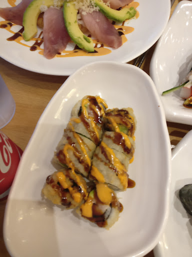 Roll wise, we ordered quite a few: Crunchy spicy tuna: exactly what you expect. A tuna roll with sriracha and that crunch powder stuff. Fine, but not memorable. Green Dragon roll: not bad, though it contains crab (which isn't listed as an ingredient - though it's actual stick crab rather than crab salad). Palm Beach: very similar to the GD roll but replaces the crab with entirely too much cream cheese. It's weird to have cream cheese be overpowering, but they pull it off. Yam tempura roll: very disappointing. Substantial amount of yam in the roll, but the tempura is super thin and gets super soggy, and the yam itself was overcooked so it was just kind of a mushy mess. standard Salmon Maki: surprisingly great. Lots of fish. Dancing Tuna: this is a deep fried roll that we ordered on a lark, and we definitely wouldn't order it again. It's fine, but unfortunately it seems that the frying takes long enough that the fish is completely cooked, and that definitely takes away from the taste.