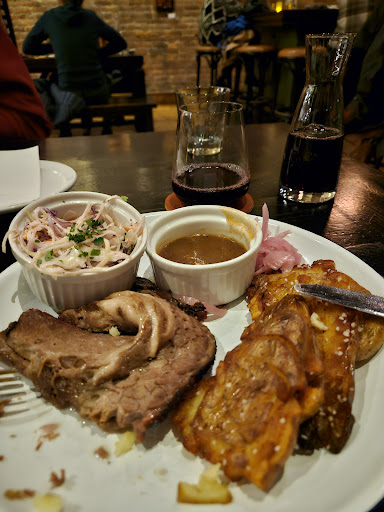 Not enough can be said about the food here. A caddy of 4 bbq/ hot sauces was brought to the table; each excellent in their own way. The brisket left nothing to be desired. A healthy portion of tender, tasty beef, smooth mashed potatoes, and an array of well matched sides and garnishes made for a filling meal. The pork sliders could easily have been a meal on their own (I would add a side). A nice crunch contrasted the rich, tender pork. And the locally sourced bun enveloped this tiny masterpiece perfectly. It's hard to believe the same chef making these well rounded main dishes could also have a flaky pie crust perfected, but there is no other way to describe the pecan pie. More nuts than one typically sees, and a crust that managed to be crunchy and fluffy without being too buttery, made this dessert a little less rich than expected. It was a welcome surprise after the hearty meal that preceded it.