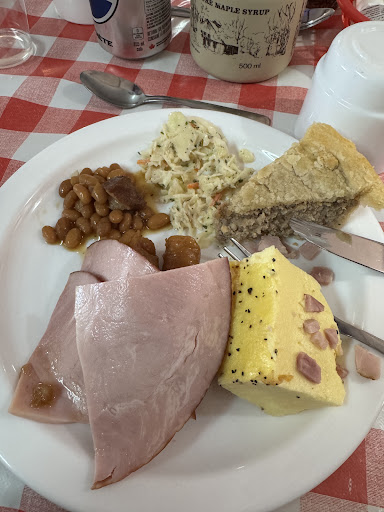 Tel que mentionné par d'autres, la soupe aux pois est excellente mais le sirop ne prédomine pas dans le menu. Le menu comprend de la salade de chou (très bonne), de la soupe aux pois (excellente), des oeufs en bloc (fades et texture peu intéressante), des bouts de saucisses à hot dog, de la tourtière (très fade), des tranches de jambon minces et froides, des fèves au lard (elles étaient OK), des crêpes (ou plutôt des pancakes, elles sont petites et épaisses) et des grands-pères dans le sirop (très bons). Il n'y a pas de bacon.