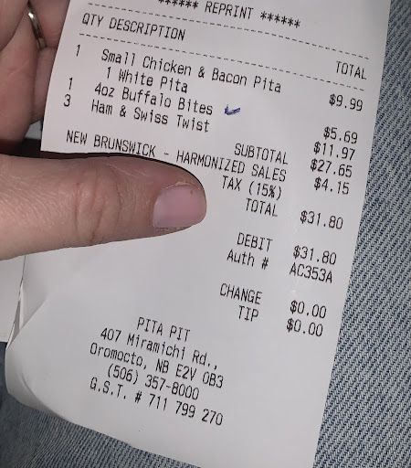 Read moreI want to make it very well known to anyone who is thinking about eating at the Oromocto pita pit to greatly reconsider that thought. We were the only customers in the drive thru and the employee was very rude and condescending while speaking with us. When asked if we wanted any veggies on the grill I turned to ask my fiancé what she would like and within two seconds he was asking if we wanted them on white or whole wheat. I told him that we didn't even decide what we wanted on the grill he replied with " well you didn't answer." In a rude tone and continued to talk over me. I don't know who would even think that this is how you even speak to a customer but it is clearly the very wrong way to speak to anyone in that manner. The disrespect is what made me decide that this pita pit is a place that no one should ever visit. Management needs to do something about their employees and how they are treating their customers because this is a very serious problem that will only end up in that store shutting down due to lack of customers. But hear what I have to say and do not set foot...