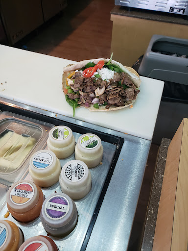 Read moreTake out only. Read COVID-19 and comply with instructions, on front doors, before entering. Had a small falafel that was made with tlc and it was great! Pita Pit steams the pita bread, briefly, for ease of opening and encouraging flexibility for filling and rolling. As your chopped falafel balls warm on the grill, you choose from a variety of veggies, cheeses and fruit (olives and pineapple) to delight your tastebuds. Add any one or more of the available sauces. Now the warmed, chopped falafel is added...a slight shake allows the fillings to better sit in the pita pocket. Tuck the flap while gently compacting the filling behind it, roll until other flap meets with roll. Wrapped in parchment paper for ease of peel and eat. HINT: As you peel the parchment, let it cover your hand (helps catch juices and falling bits). Thank you Pita Pit for the extra efforts you take to keep us all safe, including yourselves. Sanitizer available at...