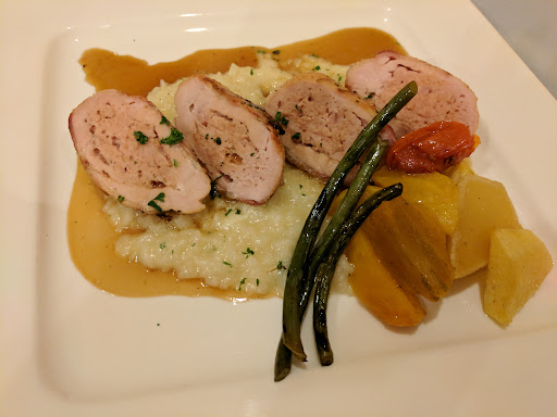 The food, one of the best meals we have had anywhere, the presentation hot, simple, elegant and perfectly seasoned: Potato and leak soup - light but creamy scrumptiousness, beet salad - beautiful to look at and the citrus and labneh dressing with burnt almond delicious. chowder - chock full of seafood and taste! Appetizers were the perfect size to keep us wanting more and looking forward to the mains. And the mains did not disappoint. The days special, strip loin steaks came out perfectly cooked - rare and medium rare on top of potato puree (yummy mashed) and fresh asparagus hot but still with a crunch, the woody stem ends peeled (such perfect detail!). The risotto was equally perfect with perfectly cooked scallops and crab, and my Beef Paupiettes was unique with the rich mushroom ragout, wild rice (which too was perfectly prepared) and also the perfect asparagus.