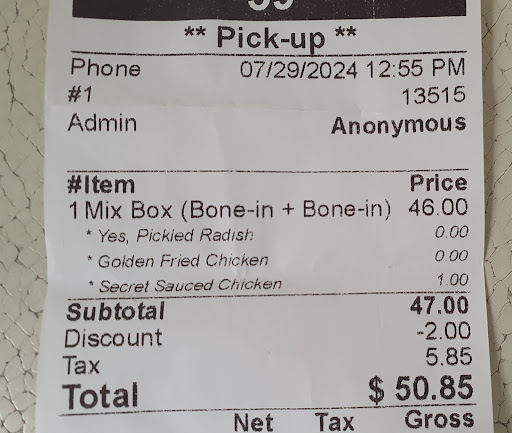 Ā Ā Ā Read moreI'm sharing my shock from yesterday. I ordered two fried chickens, but there was a deal that gave me a $2 discount, so I changed it. I'm not talking about the size of the chicken being too small or too big, but I got two legs, one wing, and five bones, not even chicken breast. I'm so shocked by the hopeless sales method, and I'm leaving a review to help other buyers. Chickens always come with two wings and two legs. Isn't that true? Thank you for your ridiculous answer. I found out today that you use half a chicken when ordering a whole chicken. And since you have an excellent talent for passing the responsibility to the customer, please keep your duty of notice. When a customer orders a whole chicken, the seller uses half a chicken and marks it as a whole chicken. And the important thing is that when you order two chickens have four legs and four wingns, but you only get two legs and one wing. I hope this fact is widely known to those around you so that your business methods can be properly evaluated. (š = 2...