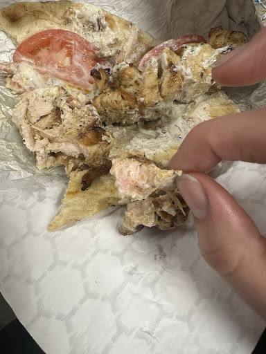 I hate leaving reviews good or bad but I know how crucial they are to other peopleâs decision making and thought some people could benefit from this! I used to visit this location plenty of times and although the employees donât really act like they want to help you and kind of give off un enthusiastic energy, that didnât really bother me. A couple days ago, I get my usual chicken souvlaki pita and bit into my chicken and saw it was raw⊠I know the slightest bit of pink for chicken on a skewer is normal but this was jello- like consistency and more pink than any chicken iâve ever seen. Hopefully the picture does it justice. I did try reaching out to the companyâs customer service just to kindly let them know and they didnât answer. Itâs disappointing because I loved this location but now iâm afraid to...