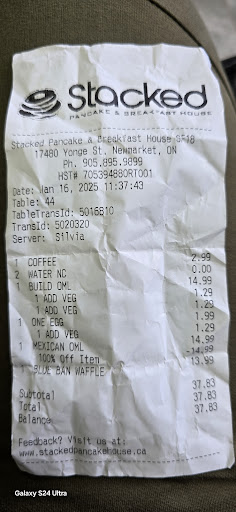 Read moreIf you're looking for a great brunch spot in New Market, then look no further than Stacked Pancake and Breakfast House. This restaurant has a lot to offer, including excellent food, reasonable prices, and a friendly staff. I recently had the pleasure of dining at Stacked and was blown away by the quality of the food and service. One standout dish that I tried was the Mexican Hash, which was flavorful and filling. The combination of eggs, potatoes, peppers, and spices made for a delicious and hearty meal. Another standout dish was the Spinach Crepe, which was light and flavorful. The crepe was filled with spinach, mushrooms, and cheese, and topped with a delicious hollandaise sauce. One of the best things about Stacked is the reasonable prices. For the quality of food and service, the prices are very reasonable, making it an affordable option for a delicious brunch. However, be aware that there can be a bit of a wait on weekends, so plan accordingly. The staff at Stacked was super friendly, especially Tara who showed us to our table and Mona who took our order. They were attentive and knowledgeable about the menu, making helpful suggestions and ensuring that we had a great dining experience. Overall, I highly recommend Stacked for brunch. The food is excellent, the prices are reasonable, and the staff is friendly and attentive. It's definitely worth checking out if you're...