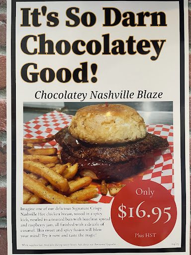 Read moreAmazing food at this stop. We got chicken Burgers, wings and fries. As soon as we walked in we were greeted very kindly and when it was clear it was our first time the menu was described in detail to us and an effort was made to help us get what we would enjoy. When ordering I requested one of the hotter Burgers, Volcano, and the owner was nice enough to give me a sample of the sauce before to ensure I would enjoy it and got the right item. Others got the Buffalo and Nashville wings, parmesan fries, mozzarella sticks and Chicken Parmesan burger. Every item was some of the best we've had. The volcano burger made with their homemade sauce was a really good heat for somebody who likes spices and had a delicious fruitiness to it too. The flavour doesn't just come from a simple sauce spread on the buns but is incorporated into the food so well. The Buffalo wings were delicious and saucy, and the nashville were probably the best dry rub wings I've ever had. All the chicken was very delicious and the wings are nice and big and juicy which just adds to the amazing seasoning / sauce. Even something as seemingly simple as the marinara provided with the mozza stick and the chicken parm wasn't overlooked and was more than just your basic jar of marinara. The fries were a good crispy frie similar to the style of other chicken joints but done very well. Makes us wish we were locals to be able to come back and try even more of the menu and have it as our local chicken joint, but in lieu of that I can't recommend this place more for others to discover and be...