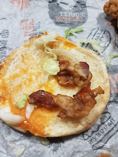 Read moreThis is just the fourth time my Wife and I have decided to dine out from this location. Couldn't tell you the last time I even went to a Harvey's for any food, to be honest. Just isn't a place I go to. First time seemed quite good. Second was seemingly the same. On the third visit, however, this is where my happiness turns up daisies. I bought two classic burgers with no ask or mention if I wanted cheese or bacon. While burgers were being topped, the lid from the mustard bottle decided to take a dirt nap and dive into one of my burgers along with enough mustard for a 10 year old's birthday party. After a quick chuckle from the very young employee, they decided to just carry on and finish the toppings and wrap it up. Bun painted yellow, mustard oozing from all sides. For a moment, I thought, "had I asked for some burger as a topping to my mustard?" "Oh, I''ll just get that when I get home," I sarcastically added. Employee without a clue that this should be considered NOT ACCEPTABLE and make a new one. Nearly had enough mustard, after scrapping it down with a spoon, to fill my half empty bottle in the fridge. Felt guilty all that tangy, yellow gold was gonna be wasted. Such a shame. Also, requested a chocolate shake. Straws make a terrible shake mixing device, BTW. I used the same spoon from the mustard to stir the shake back to something that looked like a chocolate shake. That was weird. Burgers were fine. Now, I understand quite clearly, I'm a grown man. I could certainly have asked for a re-do on the "mustard mishap" but I decided to let it slide and not embarrass the young worker. However, after tonight's debacle, it will be the last time I dine from this location. My wife decided to pick up. We asked for bacon. Once she returned home, she had to open up her burger just to find where the bacon was. So, I did the same and eventually found this. (see fig. 1) There is more bacon on a cow than this incredibly sloppy and horribly assembled Buffalo Chicken Burger. Bacon is a noun and, as google states, can be countable or uncountable. I believe this bacon is uncountable. $1/piece. C'mon. Adding to this burger treachery, it had sauce on only HALF of the western hemisphere. (see fig. 2) It was....flavour, flavour, nothing, nothing, nothing, flav...nothi, flavour. Brutally horrible. I made better works of art when I was 16 working for the Golden Arches. Harvey's @ McLeod, better do an audit of your customer service and quality assurance. This haphazard attention to quality for your customers will likely lead this location to dust. Now my wife is annoyed at me because I left an honest review. I just...