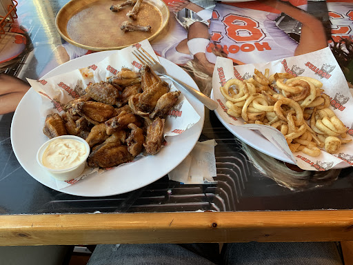 On Sunday, May 21, 2023, we arrived at Hooters and immediately encountered slow service. It took a frustratingly long 10 minutes for our drinks to arrive, and placing our orders proved to be an arduous task as well. Our initial choice to share a plate of calamari turned out to be a mistake. The calamari was greasy, extremely rubbery, and oddly thick, leaving much to be desired in terms of taste and texture.