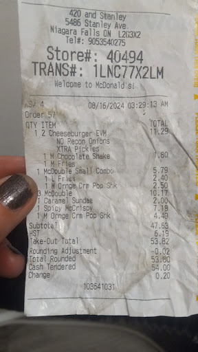 Around 330am 4 of us pulled up to the drive thru at McDonald's on Stanley Avenue in Niagara Falls. My friend ordered 2 cheeseburgers and wanted to make one a meal. The drive thru attendendant told us that cheeseburgers aren't available as a meal. We were confused, then she said we could make it a 2 cheeseburger meal. She asked what we wanted to drink and my friend asked what kind of mcflurries they have. She said we can't get a mcflurry as a drink. We thought they could just make it an upcharge. She ordered a chocolate shake instead. We started to continue ordering, then the screen went blank and everything was silent. We kept saying hello then decided we should drive up to the window. When we got there we were told they cut off communication because we were laughing... We then finished our order which was a spicy mcchicken, 4 mcdoubles, fries, a chocolate shake and 2 orange shakes. We pulled around and waited for our order. The employee who brought us our food was very nice and funny. When we tried our shakes, they all tasted love vanilla. We pulled back around to have them remade. We thought it would be a quick switch but it was not. They argued with us. We weren't asking for our money back, or looking for an argument, we just asked them to put extra syrup in them because they tasted like vanilla. The manager (we are guessing she was, she's the one who made out shakes so told us SHE made them and she KNOWS they are right amd refused to fix them for us told us we are wrong, the shakes are exactly as they should be. I 've worked in the customer service industry for 25 years. We have all been thought the importance of the saying "the customer is always right". Never would I EVER blatantly tell a customer they are wrong and refuse to correct the problem. I would love to know who trained these employees, and that manager. She had us take our lids off our cups and look at the color to prove to us that the 2 are orange and the 1 is chocolate, She had us taste them again. Th3y were lightly tinted with coir and tasted vanilla. We just wanted extra syrup in them...could have been such an easy fix, intrad she treated us like we were children. We're not annoying drunk teenagers who are difficult to deal with. We're in our early 40s and don't get out much. Thought it would be fun to go to McDonald's after we left the casino, just like the old days going to that location. They could have easily fixed the probkem, made us happy customers, return customers, who gave them good reviews. Instead they were rude, unprofessional and refused to fix our problem. I would never train my employees to treat their customers like that and I would never want employees like that working for me. So unfortunately we'll never go back there again they've lost customers and received a very negative review. The only good thing I can say about the experience was that the fries were hot and my chicken burger was not cold. Really like sauce but it was...
