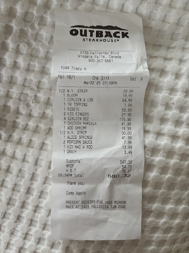 Read moreWent with a couple of my friends hoping to have a drink for a happy hour but there was no such thing there as we were told by Alexa our very friendly server. My one friend ordered a $10 glass of wine for the 5 oz which is outrageous! I had an unsweetened iced tea. We just wanted to have the Bloomin Onion as we had plans to go elsewhere for dinner but we all just wanted to check out the menu and the place as it's been years since we went to an Outback in Canada. The blooming onion was always one of our favorite appetizers to have when they used to have their location in Oakville and Mississauga. Well it might have been good but there were two things very wrong with it! The onion had not been prepped and cleaned properly prior to putting the seasoned flour on it. If you took the deep fried onion from the outer layers the onion itself was very dry like paper. The onions toward the center were okay because they were fresh and not the outer peel. The second thing wrong with it was the price $15.99 for an onion? Are you kidding me?? I can buy many bags of onions for that price at the grocery store. The dip served with it is very good. And to top it all off make sure you look at your receipt first because they charge you the Niagara Falls tourist fee NFDF. It is a city fee tax which you can refuse to pay. Alexa did not take offense when I asked her to remove it from the bill . She was very accommodating . As if tourists don't have enough to pay by renting cars and reserving hotels and all the other costs associated with a holiday. I'm not even a tourist anymore and live locally and was so glad I looked at the bill for this. I have yet to see this fee added on receipts at other restaurants but considering we had an onion iced tea and a glass of wine and it came to $38, once the fee was taken off the bill, it was $35! Way too much money for what we had. Ask to look at a menu BEFORE you sit down! We will not be back, we will stick to the Outback in Florida. We did check out the menu it is very attractive, however the prices are the complete opposite. If I'm going to have a steak I'll go to The Keg Fallsview where at least I get a view. Thank you to Alexa for being the best part about...