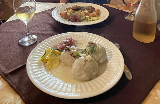 We started with a a Mulberry Vodka and Raspberry Courvoisier, both delightful. You must try the garlic bread...the bread is thick and homemade. Also try the achocha salad, homegrown, homemade with vinegar and onions. Different and light. Must try the Cheese Triangles...not a ravioli, not a pierogi. A light cheese filling in the dumpling with a butter sauce. Really delicious. Entrees: my husband had the Gypsy Weiner Schnitzel and I had the Smoked Pork Potato Dumplings. Hands down, the best Weiner Schnitzel he's ever had. Cooked to perfection and the Gypsy style with a little kick made it extra special. The smoked meat in the dumplings would challenge the best pitmaster, and it was wrapped in a potato dumpling shell that was incredible.