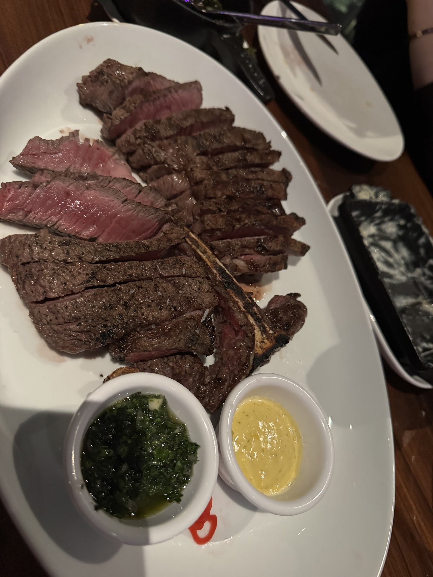 Large porterhouse 28oz (medium rare) : I’ve attached two photos for reference. First steak we received it was basically medium / well done. I’m not sure if the fire was uneven or something happened but this was unexpected considering it costs $300. We sent the steak back and the waitress apologized and said the manager “may” come by. I thought that was kind of strange that they “may” come by. Considering it wasn’t busy at all it really caught all of us off guard. After 15 minutes or so the new steak was sent out and we all agreed it was substantially better as it was actually medium rare (closer to medium but we’ll let it slide). Either way i find it ridiculous that you have the audacity to charge almost double the price for steak compared to other steakhouses then try and serve an overcooked steak. (FYI we’ve never sent any food back no matter how bad so this was).