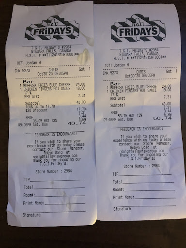 Today is our 1 year anniversary and my husband surprised me with a mini-getaway to Niagara Falls. After checking in it was almost 9 pm and we decided to give TGI Fridays a chance, especially since we had a $20 voucher (with the purchase of 2 entrees). We chose to order takeout as we are still not comfortable to dine-in during COVID-19. My husband ordered the buffalo chicken fries ($24) and I ordered the chicken fingers ($19). The menu stated that 17% gratuity was charged for groups of 6 or more. We were advised that gratuity would be charged, which we were fine with; however, we were a bit surprised that 17% was charged, considering it was take out and there is minimal service. We were advised it would take 15 minutes, so we waited in the lobby; however it took more than 25 minutes. I confirmed that we were provided with cutlery and ketchup and headed back to our hotel.