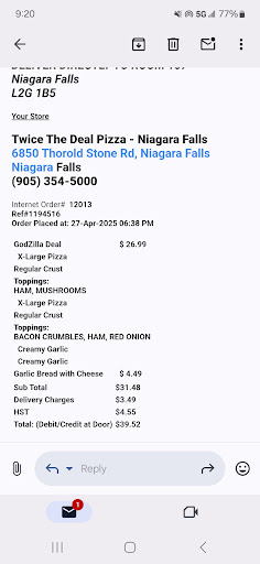 Again just ordered the same order from pizza pizza. It was yummy and arrived with no issues