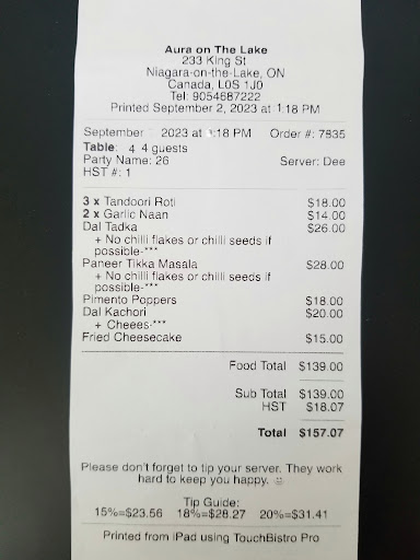 Read moreDisappointing Experience at Aura on the Lake My recent visit to Aura on the Lake left me with mixed feelings, and unfortunately, they weren't the positive ones I had hoped for. Our party of four ordered Lamb Vindaloo, Kadhai Paneer, Dahi Puri, Papri and Naan, expecting a delightful dining experience. However, what we received was far from what we anticipated. The first issue we encountered was the unexpected level of spiciness in our dishes. Nowhere on the menu was it indicated that these dishes were exceptionally spicy, and our server failed to mention it when we placed our order. This lack of communication was a letdown from the start. When we brought up our concern about the spiciness, we were met with indifference from the staff. We were told that nothing could be done since the spice was already mixed into the dishes, and the only solution offered was a small cup of yogurt to mitigate the heat. This response was not only disappointing but also far from the customer service standard one would expect from a restaurant of this caliber. The service, in general, was ordinary and didn't make up for the lackluster dining experience. Additionally, the prices of the dishes seemed quite high for what we received in terms of quality and portion size. We ended up leaving a 15% tip as a courtesy, but it was far from a gratifying experience. On a separate note, I noticed the business owner's responses to patron reviews, and they left a lot to be desired. Their replies appeared disrespectful and somewhat self-sabotaging, which doesn't reflect well on the restaurant's image. I sincerely hope they consider adopting a more positive and professional approach when addressing customer feedback in the future. In conclusion, my visit to Aura on the Lake was marred by unanticipated spiciness, lackluster service, and high prices. I won't be returning anytime soon, and I hope that the restaurant takes every feedback constructively to improve their offerings and...