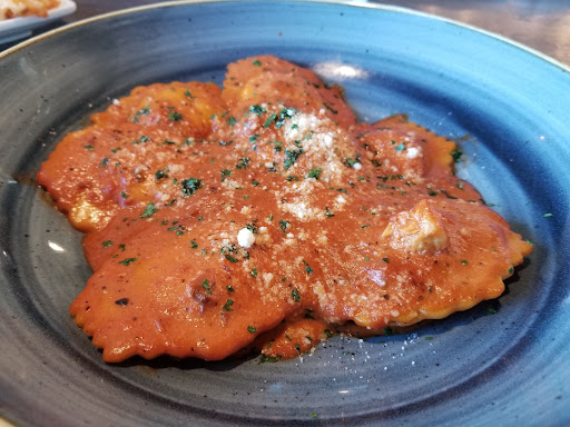 **PASTA (CHKN & KALE RAVIOLI) 2/5 NEEDS MORE SAUCE & A LITTLE MORE FLAVOUR. KIND OF BLAND IN FILLING AND SAUCE..ALSO, NOT SURE HOW LONG IT WAS SITTING ON THE COUNTER BEFORE IT MADE WAYS TO OUR TABLE, BUT THE SAUCE HAD COOLED DOWN AND YOU KNOW WHEN SAUCES/GRAVIES START TO FILM AND TURN A LITTLE DARKER? YA..IT HAPPENED BECAUSE THE DISH ITSELF WAS ROOM TEMPERATURE AND SAUCE WAS A DIFFERENT COLOUR WHEN WE DUG INTO IT.