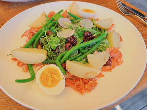 With the lighter starter and main (I had the salad niçoise), there was plenty of room for a slice of coffee cream pie ($12) for dessert. More espresso is needed in the custard layer as I found the coffee tastes rather muted compared to the cocoa powder and smear of sauce on the plate. Although the crunchy espresso brittle makes for a pretty presentation, it needed to be thinner and preferably crumbled around the plate to make it easier to incorporate into the dessert. Overall, while decent, the pie didn’t leave me...
