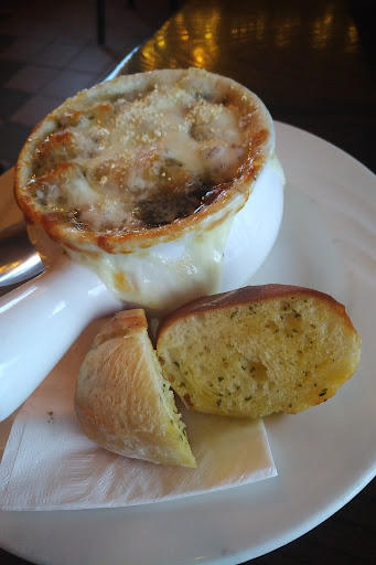 Sunday night @ 730. only one other table in the restaurant. The server took our order (stuffed mushrooms and French onion soup for appetisers, 2 plates of souvlaki for mains). Told the mushrooms were replaced by crab cakes because "too many customers, more than 50%, complained about the mushrooms". Cakes were ok. soup decent.