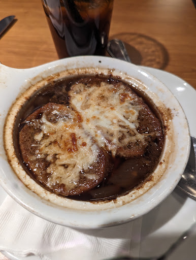Read moreWell, I was looking forward to dinner out with the family. Ordered a French onion soup and was very disappointed there was barely any cheese on the top, like really? pic attached! I never had a French onion with no cheese before and no there was none inside the soup either. Most places have it running down the sides of the bowl, hardened crispy cheese is the best part IMO. Then I ordered the Boston brute, food came out it was a burger not the sandwich I ordered, the gravy had a dry skin on top as seen in the pic, very disappointed thus far. I was told she made a mistake as both are Boston's Boston burger and Boston brute!? So they did correct it, the sandwich was there within 5min, well the sandwich wasn't what I expected either, the cheese in it wasn't even melted almost cold to the touch, I'm assuming it was because they tried to rush the food out, but I would have rather waited another 2-5min and be able to enjoy my food. Didn't eat the sandwich took it to go after a few bites. I had a Pepsi my son had a Dr pepper both drinks were flat wife had a ceaser that was the only good thing about this dinner.