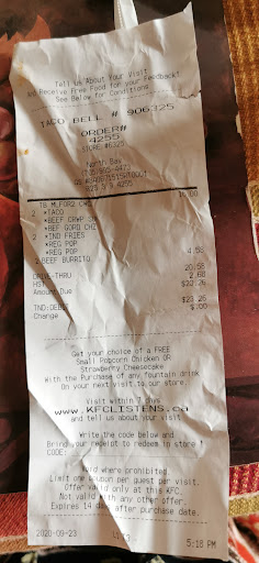 Read moreWe decided to try Taco Bell in North Bay before heading back south, I was pretty apprehensive as the Taco Bell near our home is absolutely horrible, so I read the reviews for this Taco Bell and my apprehension grew but I was also as equally starving and had a long drive home. I was blown away with the service and quality…the man who took our order was awesome, he must’ve clarified our order atleast 3 times on speaker which was nice. When we got to the window, another man read us our order again to be sure and then our food was ready in less than 2 mins. The young girl who gave us the food was so friendly and made sure to say thanks for coming and have a good night!! That is hard to come by these days, people just aren’t friendly anymore, whether it’s they hate their jobs or the customers are just so nasty that the employees hate their job but something is happening and it shows. Now the customer service was exceptional but would the food be up to par?? YES! We got exactly what we ordered, the tacos were wrapped nicely, nothing was soggy, it was sooo nice to have warm food that tasted good as well, especially after spending $40. The Taco Bell in North Bay was very good! They should have those same employees...