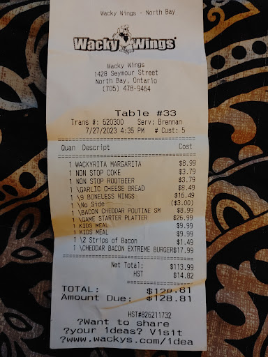 Our family went there tonight to celebrate my daughter's birthday. Brennan was our server. There was MAYBE 1 other table with customers. There was 1 table a few feet from us that was full of dirty dishes. I asked about the game area, what kind of cards they use. The server said its the same cards that Cineplex has down at the theatre, so we could use those if we have them instead of buying more. We ordered drinks 1st and it took almost 10 minutes to get 2 water and 3 pop. When he brought our drinks we put in the 2 kids orders (one was a hamburger and onion rings the other was chicken strips and peaches) and asked for a few more minutes for the 3 adults to decide. My daughter also showed the server the "Birthday Offer" she received for a free order of garlic bread. It took at least 15 minutes for the kids orders to come out and Brennan to ask for OUR orders. Another 20+ minutes for us to get our poutine, burger and fries with a side of tomatoes and 9 boneless wings plus a Game Starter Platter. We ordered a Wackyrita Margarita, a chocolate milk and a refill of sprite for the kids and it took me asking 3 times and 2 different servers before we finally got those. The burgers had no flavour whatsoever. The wings were dry as were the strips. One member of our party liked the fries, but the rest of us did not, including the kids. We werent given sour cream for the mushroom caps. When the kids went to play the games, the cards didn't work. We found out from the manager and another server that Brennan gave us false and incorrect information. We now had to buy new cards and put money on them. Then when it came time to pay, Brennan handed me the bill and before I could look at it, he started pushing the interact machine at me to rush me. I asked Brennan what the issue was with the service, that it was really horrid service and they really had no excuse I could see since there was no one else in there. He looked at me, offered no explanation and said "I am sorry you feel the service was not good" then he walked away. It was only at the end of our meal that they finally cleaned the table of the dirty dishes that were there when we were seated. When we got home, I finally had a chance to look at my copy of the bill, I found out he did not take the cost of the FREE garlic bread off the bill! To say that this experience was a disappointment is honestly an understatement.