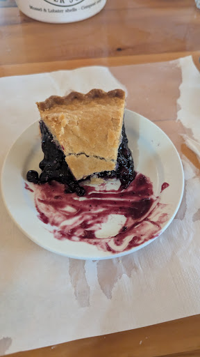At this point, our experience had done a full 180. Our server Jillian arrived quickly thereafter and remained attentive with drinks and refilling our water. My dad also got a small bowl of chowder and salad from the self-serve salad bar that's included in any entree's price. Soon after the entrees came out, I got the breaded haddock and chips and my dad ordered the wharf 1, aka a 1 lb full lobster. Did not get a photo of the lobster, I apologize. As you can see the haddock portion was very generous, I counted about 4 pieces altogether of varying sizes, along with a lavish spread of chips. The fish was delectably flaky and tender, with tangy but uniquely sweet house tartar. These are probably the best chips I've ever had with a F&C meal. Beautifully crisp outer with soft inners. It felt truly wasteful to not have enough room to finish the whole plate. Unfortunately I had to tick a star off the food rating as my dad lamented the lobster was only good, and he felt he has had better before. However he did agree that the fish and chips I ordered were delicious after trying some. Ended with bread pudding and a slice of blueberry pie. Despite being self-serve and there being essentially a pie mural on display, it did not taste old or frozen and had a delicious juicy filling.