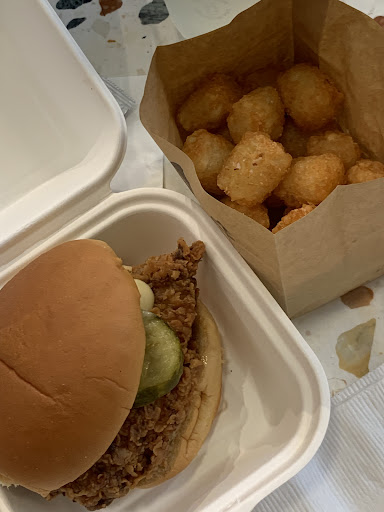The chicken is out of this world - I always get the nuggies with cajun mayo, tender and incredibly juicy pieces of chicken breast fried to perfection. You can really taste the difference that these were happy chickens! I'd love if their dips were a touch bigger, but thats just because I want leftovers, one dip is enough for an order of nuggies. The fried chicken pieces are also incredible, I'm just one of those folks who doesn't want to deal with bones. I haven't tried the sandwiches but I've seen them and they look just as fantastic as everything else. DO NOT SKIP THE TOTS! Crunchiest most delicious tots I've ever had!